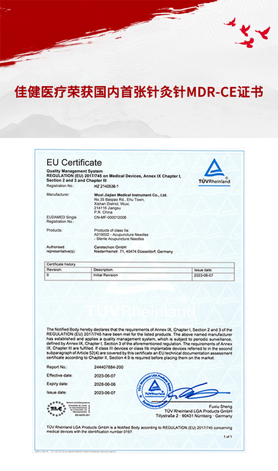 Jiajian Medical won the first MDR-CE certificate of acupuncture and moxibustion needles in China, opening a new chapter in the European market